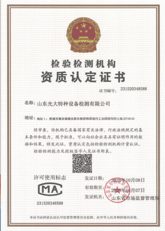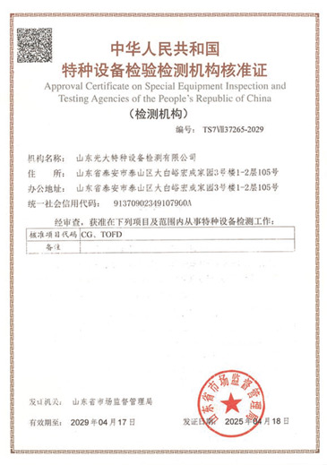 山東光大特種設(shè)備檢測(cè)有限公司是經(jīng)山東省市場監(jiān)督管理局核準(zhǔn)的甲類B1特種設(shè)備綜合檢驗(yàn)機(jī)構(gòu)。2017年9月30日取得了山東省市場監(jiān)督管理局頒發(fā)的《檢驗(yàn)檢測(cè)機(jī)構(gòu)資質(zhì)認(rèn)定證書》。2018年2月22日取得了山東省市場監(jiān)督管理局頒發(fā)的《特種設(shè)備檢驗(yàn)檢測(cè)機(jī)構(gòu)核準(zhǔn)證》(起重機(jī)械)檢驗(yàn)檢測(cè)資質(zhì)。2021年11月取得山東省市場監(jiān)督管理局版發(fā)的《特種設(shè)備檢驗(yàn)檢測(cè)機(jī)構(gòu)核準(zhǔn)證》(安全閥在線、離線)校驗(yàn)資質(zhì)。2023年11月取得山東省市場監(jiān)督管理局頒發(fā)的甲類檢驗(yàn)機(jī)構(gòu)B1《特種設(shè)備檢驗(yàn)檢測(cè)機(jī)構(gòu)核準(zhǔn)證》,具有壓力容器(RD2...